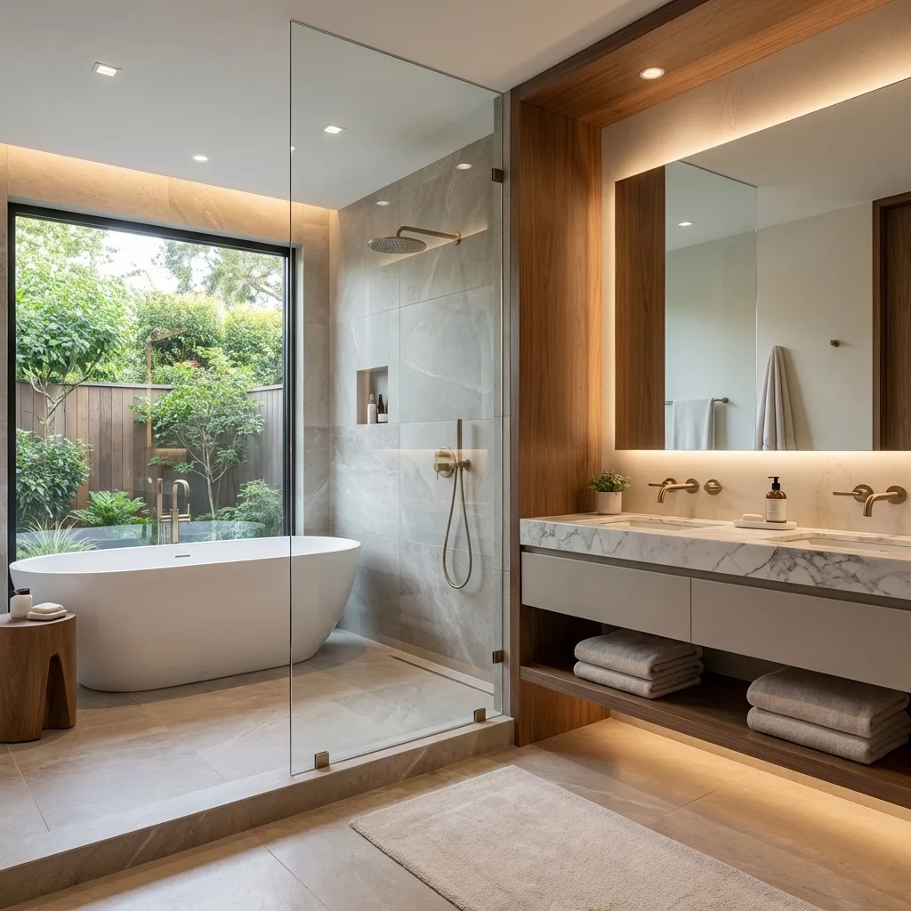 Full master bathroom remodel — marble tiles, freestanding tub, gold fixtures.